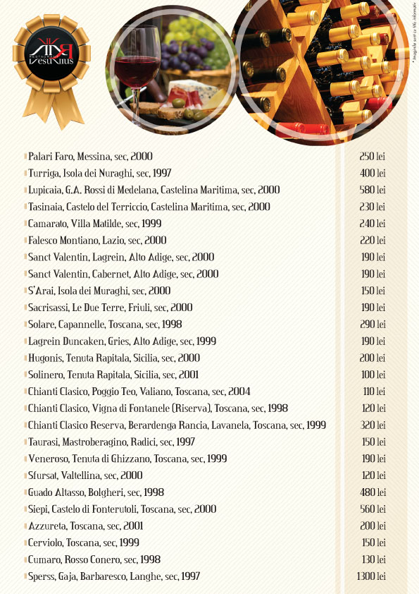 Restaurantul Vesuvius priveste arta de a gati ca pe o provocare personala pentru a aduce o revigorare bucatariei italiene internationale, combinand-o cu aromele distinctive locale si caracterul special regional.