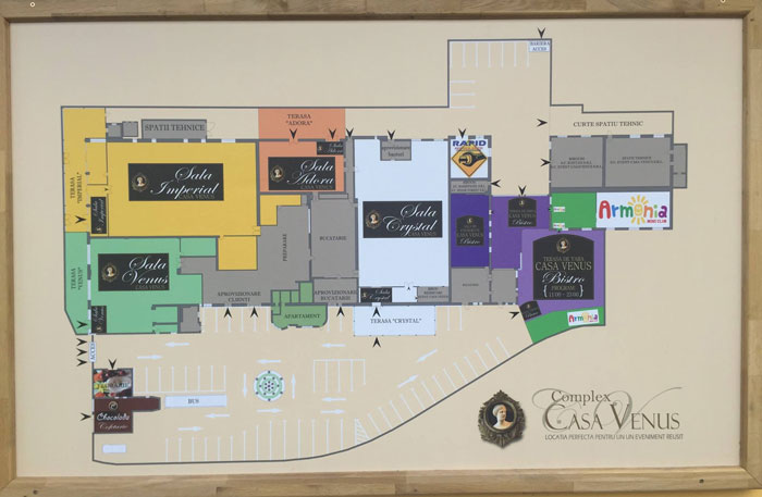 Cu o suprafata totala de circa 3000 mp, complexul cuprinde 4 sali de evenimente cu acces separat, terasa si parcare: sala Imperial, sala Crystal, sala Casa Venus si sala Adora.