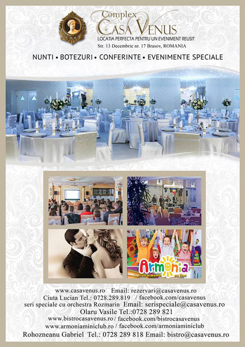 Complexul CASA VENUS din Brasov este locatia ideala pentru organizarea oricarui tip de eveniment: nunta, cununie, botez, banchet, cocktail, simpozion, revelion, microrevelion, petrecere privata, cina festiva si altele.